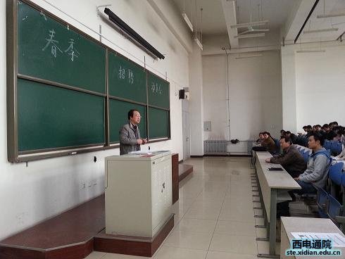月11日下午4点,通信工程学院2013年春季招聘动员会在B楼537召开。院党委副书记梁玮、09级辅导员乔兵志、黄成龙及200余名毕业班学生参加了这次会议。会议由黄成龙主持,黄成龙首先向大家通报了目前学院的就业签约情况和大家目前面临的问题,并针对3月13日的春季双选会做了相关部署。