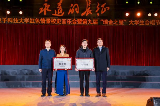 (通讯员 王星雨)2024年12月8日,为纪念“一二九运动”89周年,“永远的长征”红色情景校史音乐会暨第九届“瑞金之星”大学生合唱节在南校区远望谷体育馆举行。通信工程学院“通向未来”合唱团登台演唱《祝捷》,以饱满的热情、嘹亮的歌声、积极的精神风貌歌颂红军陕北打胜仗的英勇气概,弘扬了中国工农红军在党中央的领导下,不屈不挠、无私无畏的革命精神。合唱团最终荣获第九届“瑞金之星”大学生合唱节特等奖及最佳人气奖。通信工程学院党委书记魏峻、执行院长李云松参加活动并看望慰问合唱团学生。