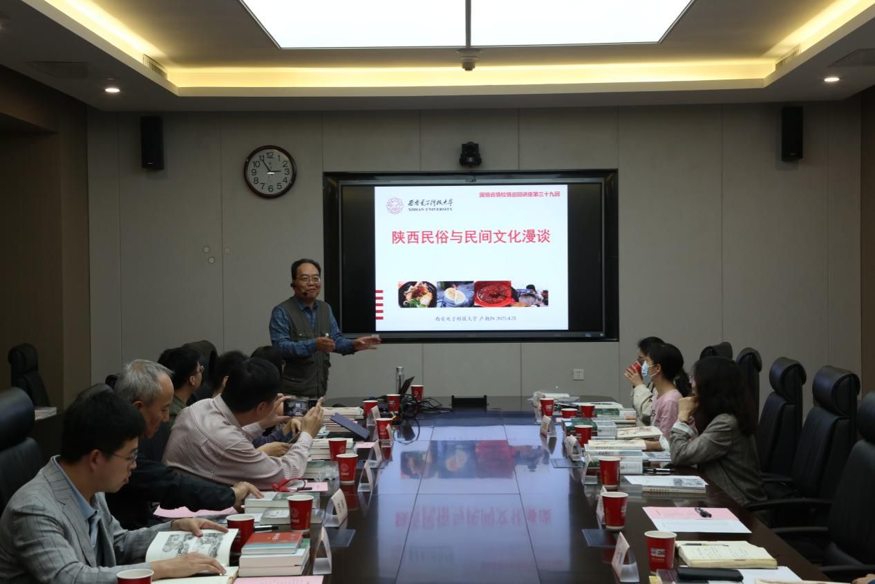 本次活动特别邀请通信工程学院教授卢朝阳作“陕西民俗与民间文化”主题分享,卢教授以其深厚的文化底蕴和生动的讲述方式,带领师生们由“从古至今的陕西”“人间百态的陕西”“民歌戏曲的陕西”三个篇章开启文化之旅。报告分享了陕西的地形地貌、青铜器的辉煌、文字的演变、衣食住行的发展等,用视频、歌曲等与师生交流互动的方式,为大家展现了陕北民歌、陕北说书、秦腔、皮影戏的艺术特色和价值。分享结束后,卢教授精心准备了《陕西民俗学概论》《远远乡》两本著作赠予现场师生。