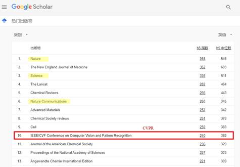 CVPR是IEEE国际计算机视觉与模式识别会议IEEE Conference on Computer Vision and Pattern Recognition的缩写。该会议是计算机视觉国际三大顶会(CVPR, ICCV, ECCV)之一,历来受国际学术界和工业界的重视,是国际计算机视觉研究机构研究实力排名的重要依据。CVPR在最新的GoogleScholar热门出版物排行[https://scholar.google.com/citations?view_op=top_venues&hl=zh-CN]中排名第10,H5中位数383,在理工类出版物中仅次于Nature, Science和Nature Communications等杂志。