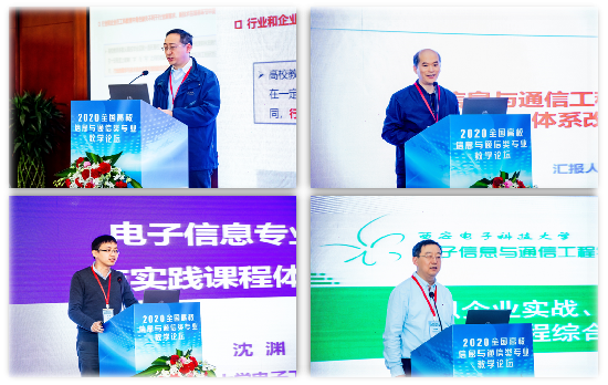 本次论坛的主题报告环节,四位专家围绕“聚焦‘新工科’卓越人才精准培养”主题,就新工科建设与实践、人才培养体系、理论与实践融合的新工科课程体系建设等方面展开了精彩分享。其中,电子科技大学信息与通信工程学院凌翔副院长为大家分享了“四新驱动,信息与通信领域的新工科建设与实践”;北京邮电大学信息与通信工程学院尹长川副院长与大家进行了“信息与通信工程专业人才培养体系改革探讨”;清华大学电子工程系沈渊副主任与大家分享了“电子信息专业理论与实践课程体系建设”;西安电子科技大学电子信息与通信工程学科国家级专业实验教学示范中心陈彦辉主任为大家带来了 “虚拟企业实战、融合创新实践的新工科工程综合型课程教学建设”的主题报告,与会代表获益匪浅。