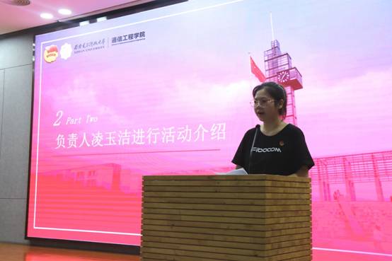 随后,通信工程学院团委组织部负责人凌玉洁向大家介绍了本届活动,她将本次活动分为五个阶段分别介绍,分别是宣传报名阶段,初审阶段,中审环节,网络投票以及答辩环节,并指出本次活动的闪光点——每一位获奖者都有着自己独一无二的颁奖词和颁奖典礼环节充满悬念的现场开奖方式,最后她表达了所有获奖者的祝福,希望选手们都能取得优异的成绩。