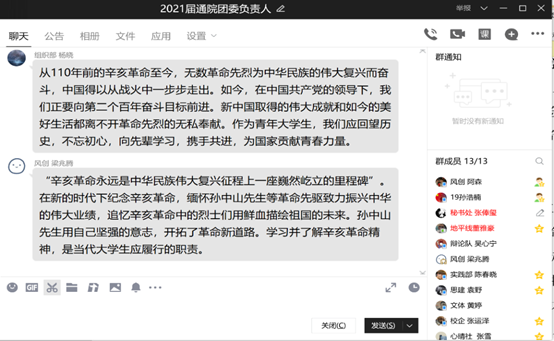 2021年10月11日晚,通信工程学院团委组织团干开展学习习近平总书记在纪念辛亥革命110周年大会上的讲话的线上交流会,会议由秘书处负责人张俸玺主持。通过观看纪念辛亥革命110周年大会直播回放及了解辛亥革命相关内容等方式,团干们针对习近平总书记在纪念辛亥革命110周年大会上的讲话所传达出的精神展开积极讨论。