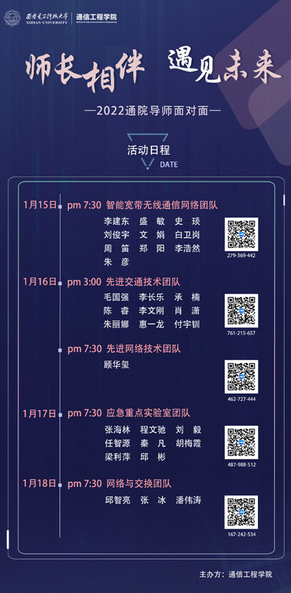 “导师面对面”是通信工程学院专门打造的一项品牌活动,每年面向高年级学生常态化开展,旨在搭建导师团队与学生之间的交流平台,为学生提供高效专业的职业生涯指导,为导师团队搭建招生宣传的平台。据悉,通信工程学院近期还将继续举办“导师面对面”系列活动,欢迎更多的学子加入直播间交流学习!