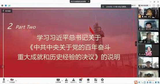 本次学习由薛喆同志主持。会议伊始,通信工程学院党员突击队队长白延军老师说明此次学习的重点与意义。他强调虽然线上学习的形式稍显简单,但希望同志们认真对待组织生活,保持“团结紧张,严肃活泼”的传统,结合抗“疫”的所见所闻、所思所行,更深入地理解十九届六中全会精神。随后薛喆同志引导大家学习十九届六中全会通过的《中共中央关于党的百年奋斗重大成就和历史经验的决议》以及习近平总书记对此的说明。通过学习两份重要文件,同志们对六中全会议题的必要性逻辑上更加贯通,对党的百年奋斗重大成就情感上更加崇敬,对党的百年奋斗历史经验认识上更加深刻。回顾历史,是为了展望未来,认清现实,从中汲取智慧与力量,更加勇毅地前行。同志们对自己身为青年,重任在肩的历史使命有了更深厚的体会。