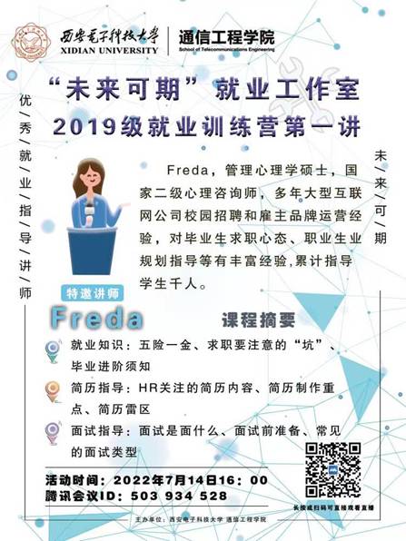(通讯员 韩静)为帮助2023届本科毕业生高质量就业,进一步推进学院就业工作,7月14日,通信工程学院依托学院“未来可期”就业工作室开展了首期针对2023届本科毕业生的“就业训练营”活动,活动邀请了掌趣科技资深HR、优秀就业指导讲师Freda为同学们进行就业知识和技巧的讲解,助力毕业生提升就业本领,帮助突破就业难关。通信工程学院2023届74名本科报名参加了本次活动。