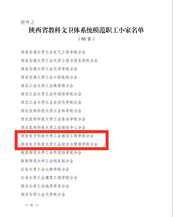 (通讯员 王思阳)近日,陕西省教科文卫体工会委员会下发《关于表彰陕西省教科文卫体系统模范职工之家、模范职工小家、优秀工会工作者、优秀工会积极分子、优秀工会之友的通报》,西安电子科技大学工会通信工程学院分会荣获陕西省教科文卫体系统“模范职工小家”称号。