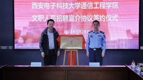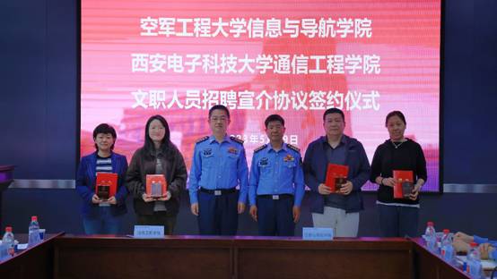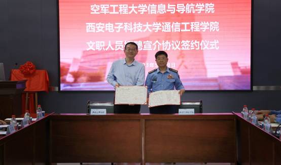 (通讯员 童宣)5月29日上午,西安电子科技大学通信工程学院与空军工程大学信息与导航学院在北校区主楼219会议室举行文职人员招聘宣介协议签约仪式。通院党委书记魏峻、执行院长李云松,空工大信院院长魏军、党委书记高修尧出席签约仪式。会议由空工大信院政治工作处主任张战兵主持。