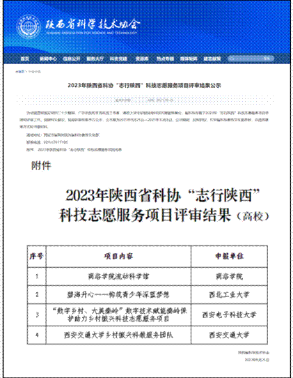 (通讯员 韩静)近日,陕西省科学技术协会发布《2023年陕西省科协“志行陕西”科技志愿服务项目评审结果公示》,共有6个项目入选,其中高校项目4个。西安电子科技大学通信工程学院“数字乡村、大美秦岭”——数字技术赋能秦岭保护助力乡村振兴科技志愿服务项目成功入选。
