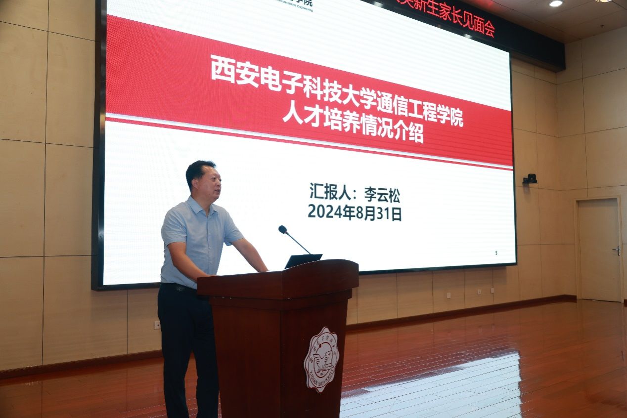 李云松围绕学院基本情况、重要成绩、发展思路、育人举措四方面向2024级新生家长作了详尽介绍。李云松谈到,经过93年的建设发展,学院为国家培养了一大批通信与电子信息领域的精英人。学院各项事业蓬勃发展,秉承“以学生为中心”的理念,坚持“立德树人”根本任务,建设“一引领四融合”的行业特色拔尖人才培养体系,传承西电红色基因,以党建引领为抓手,厚植学生家国情怀,引领学生牢记科技强国使命,服务国家重大战略需求。