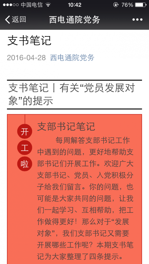 为了做好氛围营造,学院党委充分利用新媒体平台,在学院网站设立了“两学一做”专栏,及时上传更新学习材料。同时,搭建“西电通院党务”微信平台,以“规范、透明、深度、及时”为目标,服务全院党员干部经常性学习,增强基层党组织的凝聚力和战斗力。具体推送“学习文选”、“干部必读”、“党员亮牌”三个栏目的学习教育内容,展示“支部特色”、“关爱引领”、“开放教学点”、“党课预约”四个栏目的支部工作情况,举行“周周练”、“开奖啦”两个栏目的线上党史普及竞赛活动,真正做到线上线下一盘棋,营造氛围来学习。(通讯员 李警)