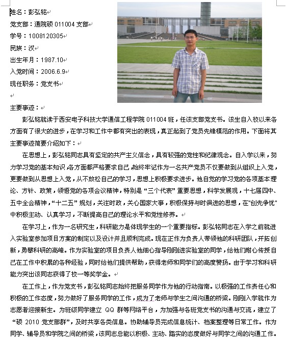 硕011004支部优秀共产党员彭弘铭事迹简介